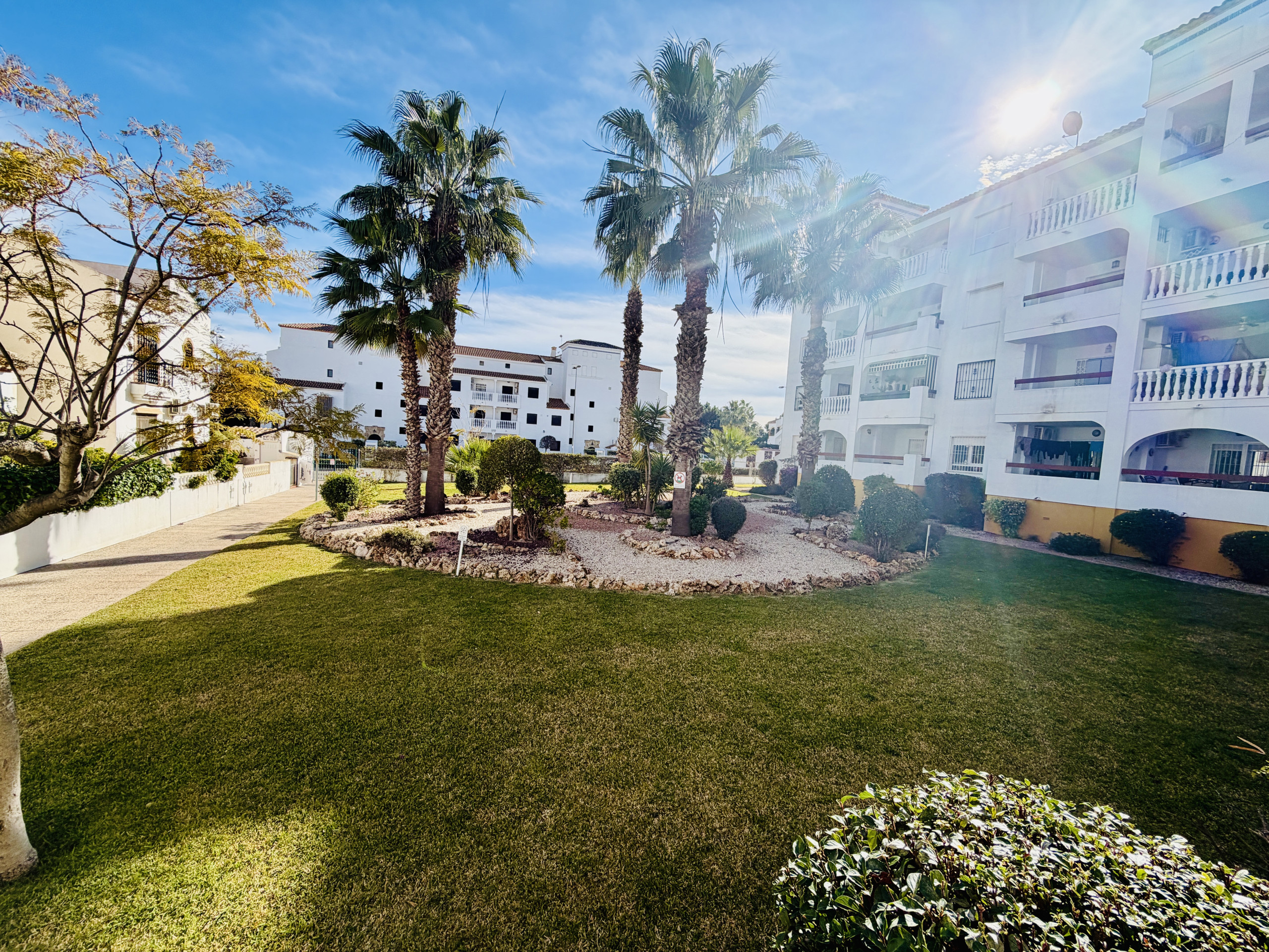Modern apartment in Orihuela Costa, on the Costa Blanca, Spain with communal pool for 4 persons. The apartment is situated in a holiday complex with bar and restaurant, close to shops and supermarkets and at 2 km from Playa Flamenca beach.
