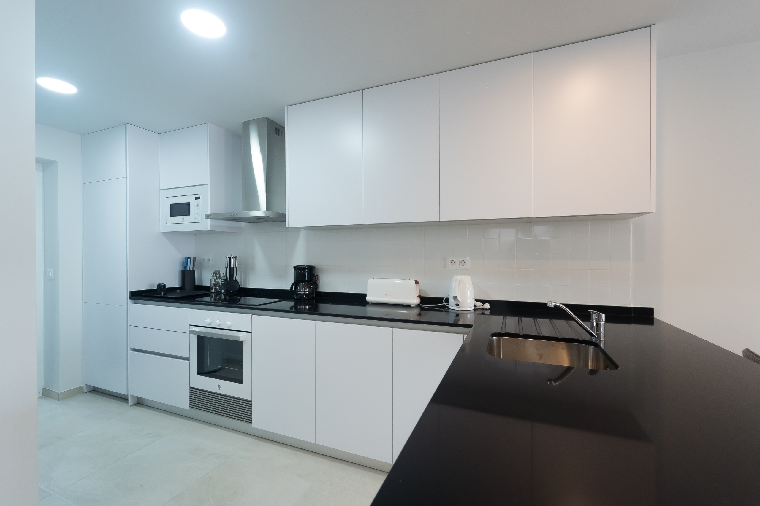 - open kitchen with induction cooker, electric oven, microwave, dishwasher, refrigerator, freezer, coffee machine, electric kettle and toaster