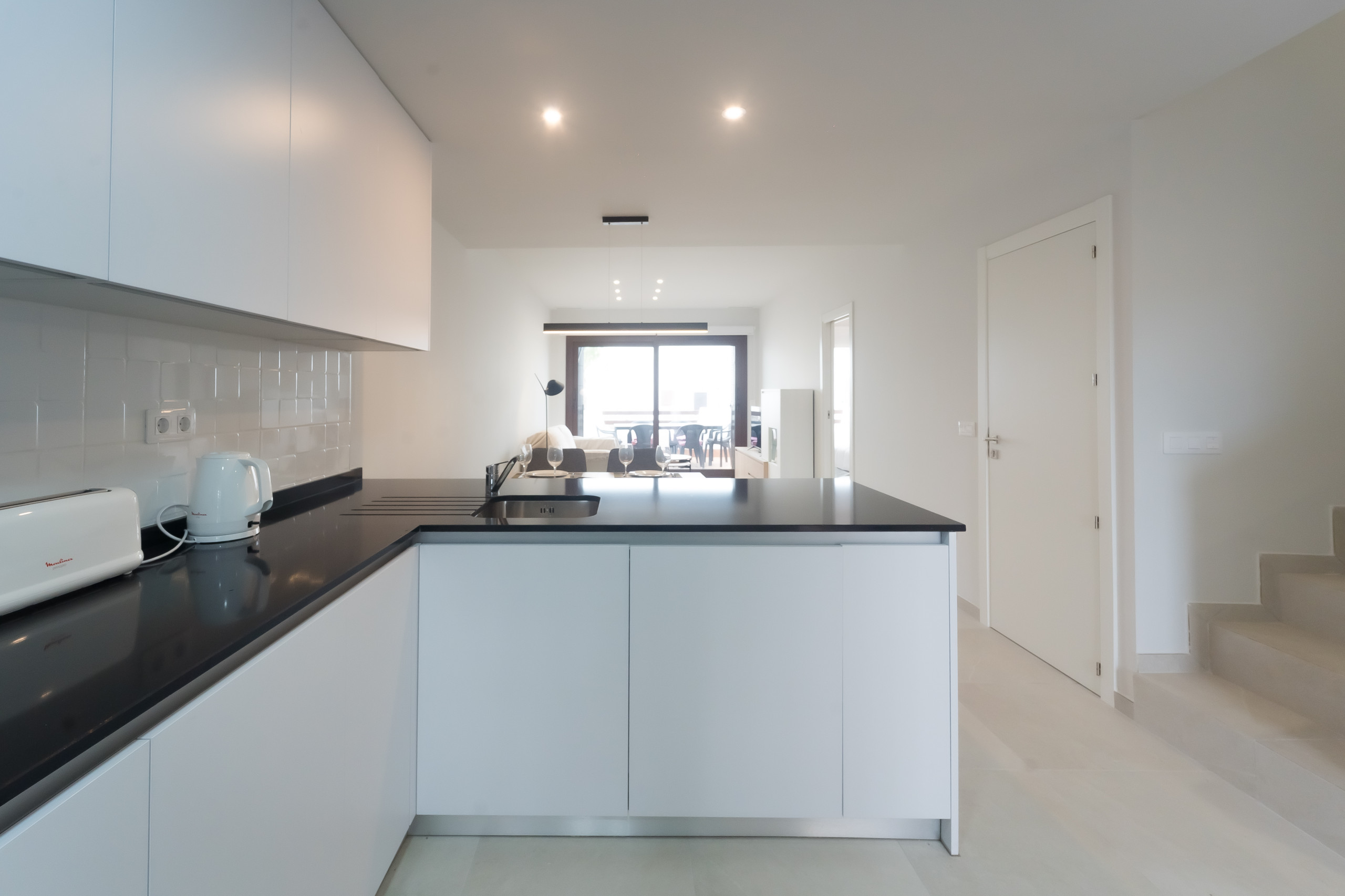 - open kitchen with electric hob, electric oven, microwave, dishwasher, refrigerator, freezer, coffee machine, electric kettle and toaster