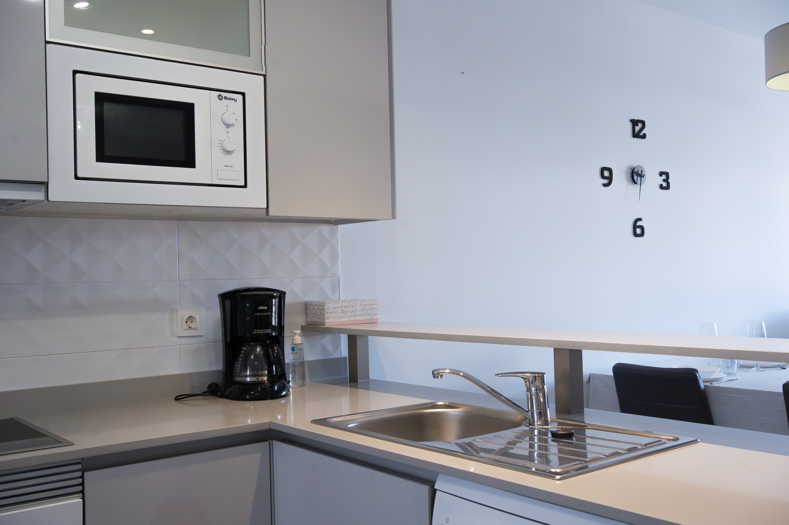 - open kitchen with induction cooker, electric oven, microwave, dishwasher, refrigerator, freezer, coffee machine, electric kettle and toaster