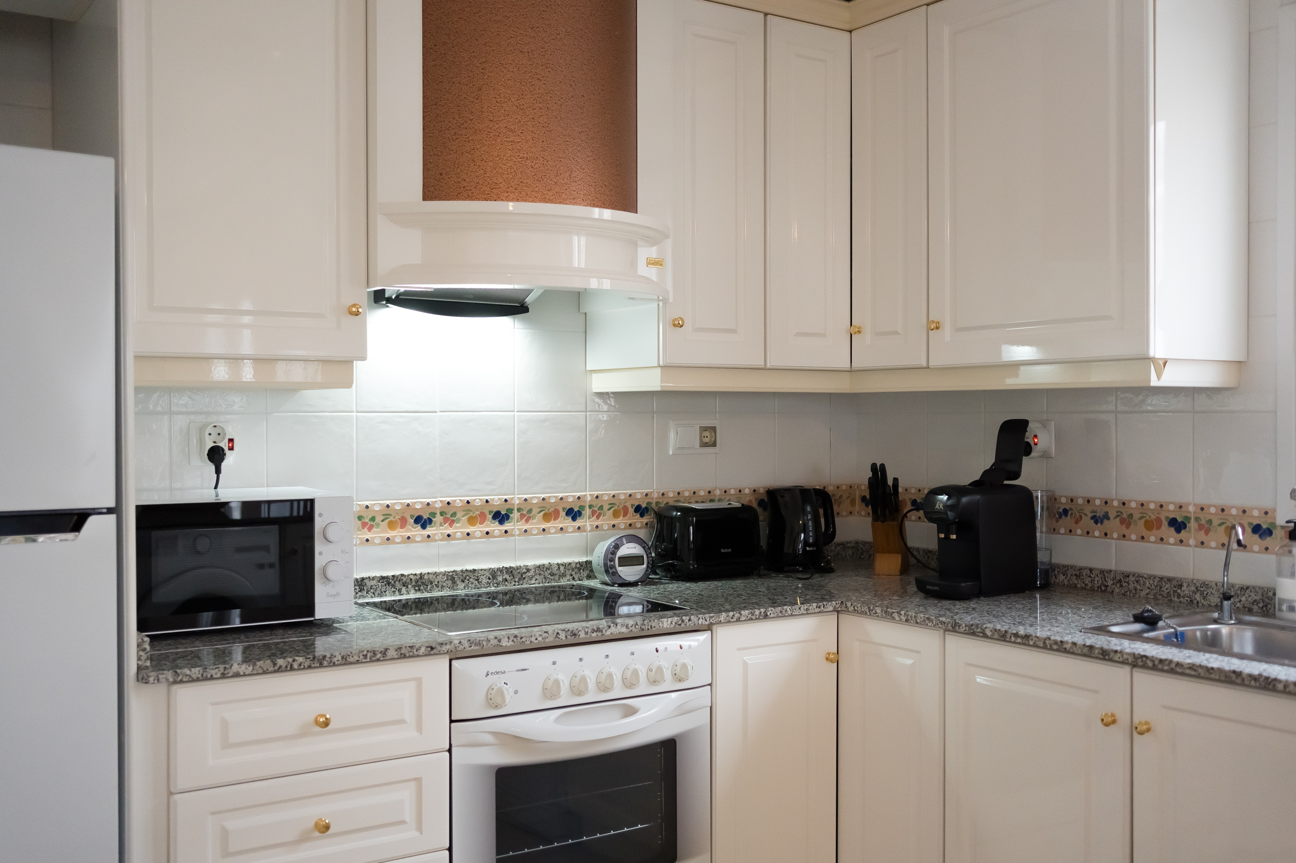 cocina americana con cocina eléctrica, horno eléctrico, microondas, lavavajillas, refrigerador-congelador, cafetera, calentador de agua, tostador y exprimidor