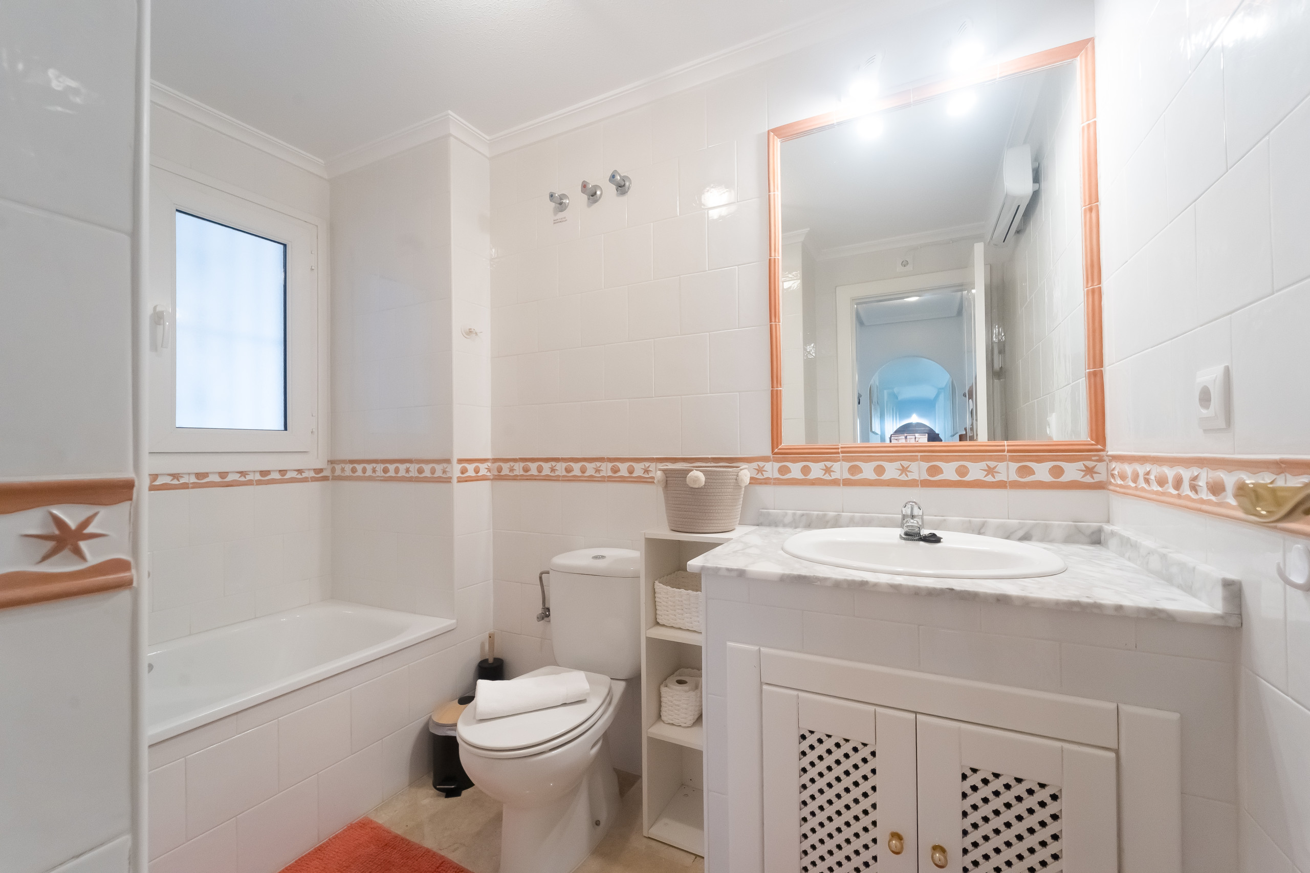 El apartamento cuenta con dos dormitorios que pueden alojar hasta 4 personas, ideal para familias pequeñas o grupos reducidos. Dispone de una cama doble y dos camas individuales, garantizando un descanso reparador para todos los huéspedes. La distribución incluye dos baños, uno con ducha y otro con bañera, proporcionando total confort y privacidad.