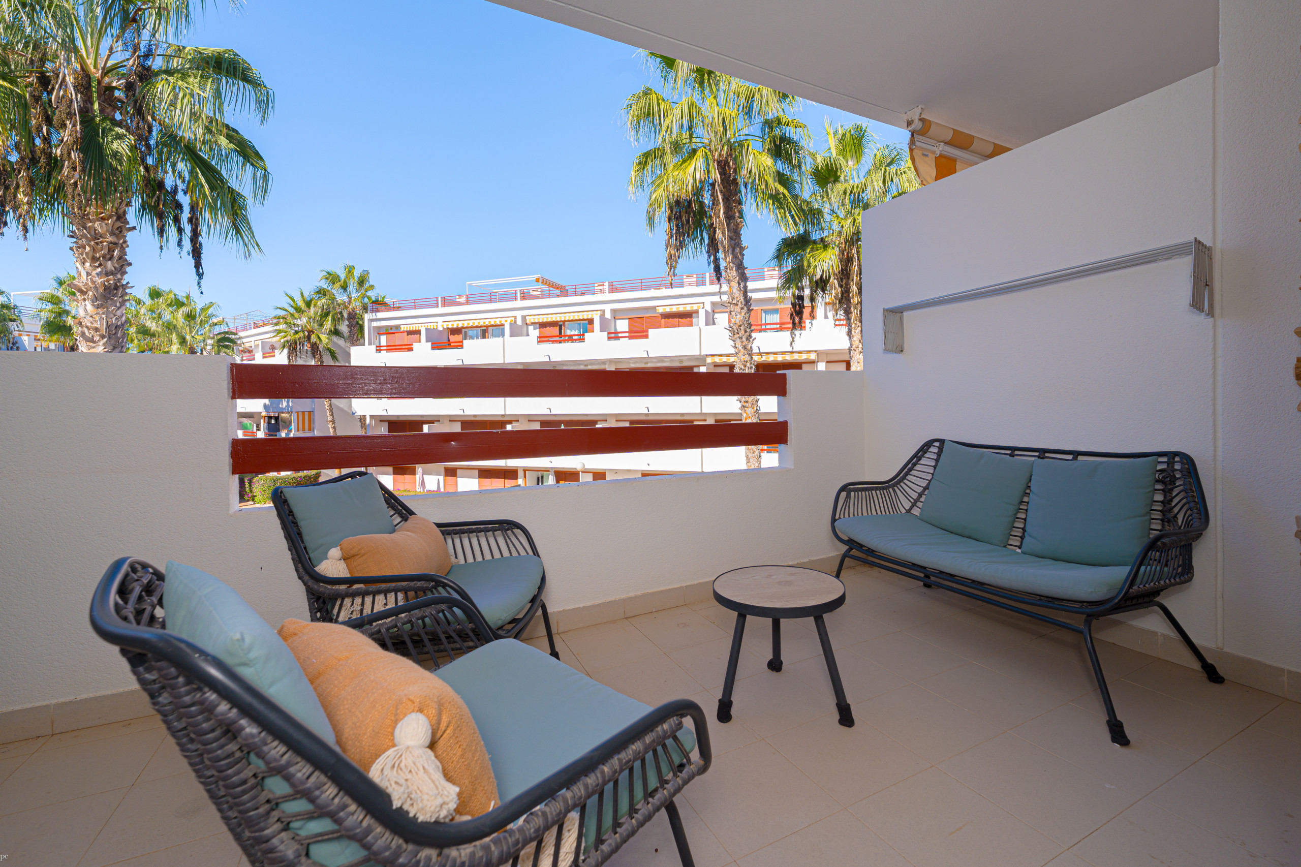 Apartamento moderno en Orihuela Costa, en la Costa Blanca, España con piscina comunitaria para 4 personas. El apartamento de vacaciones está situado en un complejo turístico con bar y restaurante, cerca de tiendas y supermercados y a 2 km de la playa de Playa Flamenca.