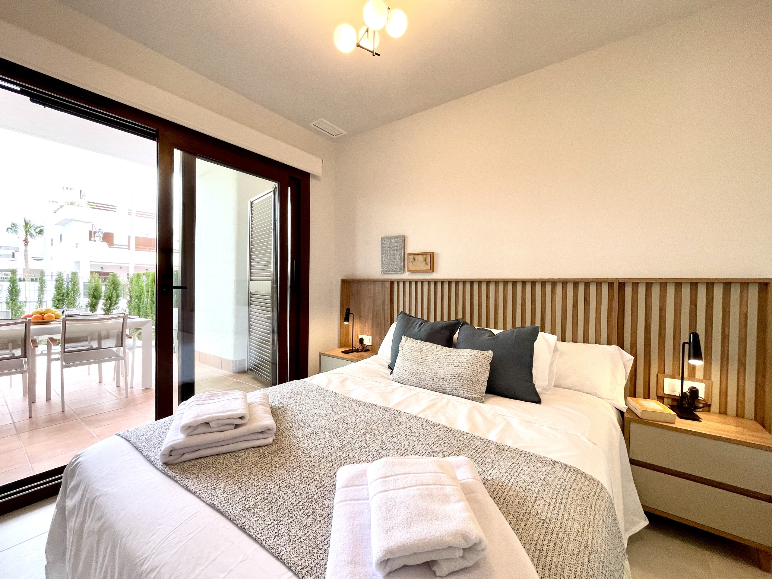 - Dormitorio principal con cama doble y acceso directo al jardín