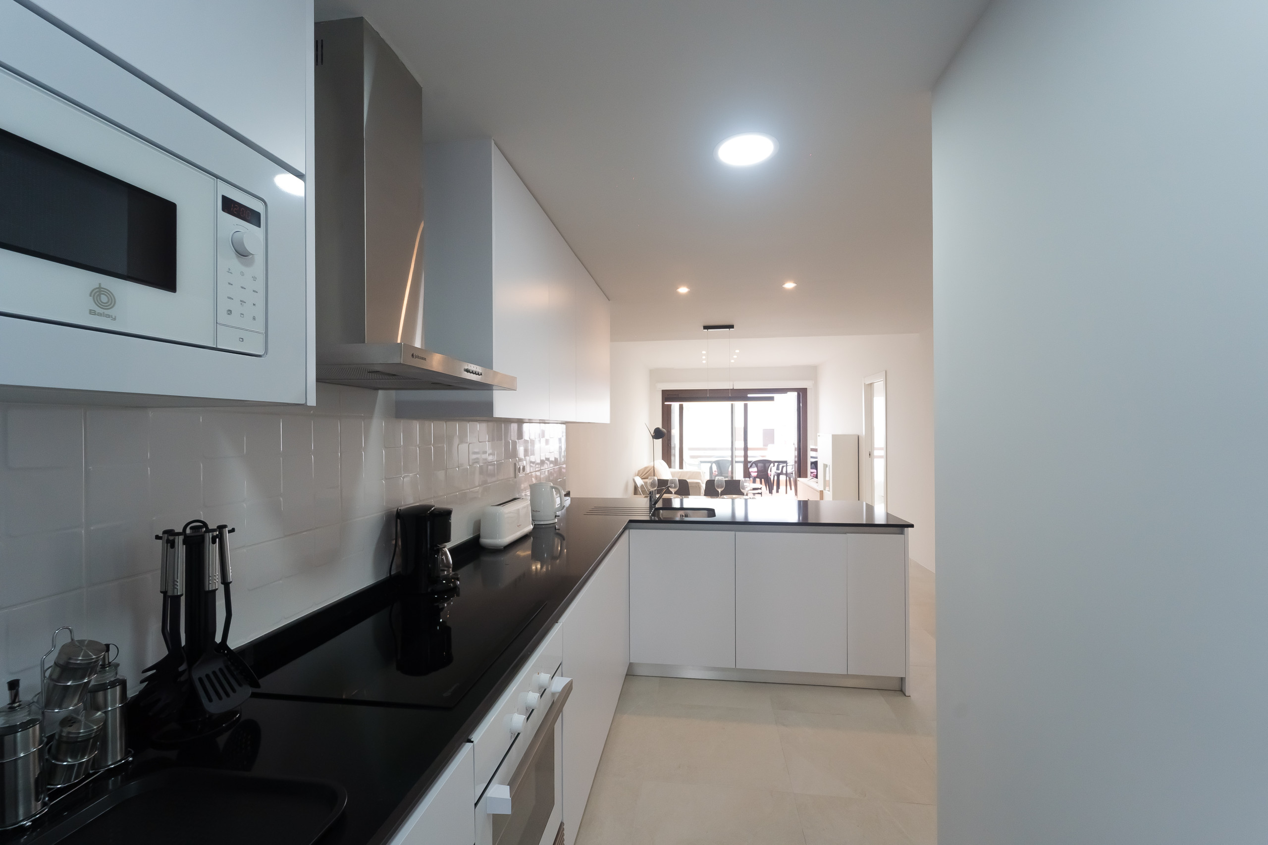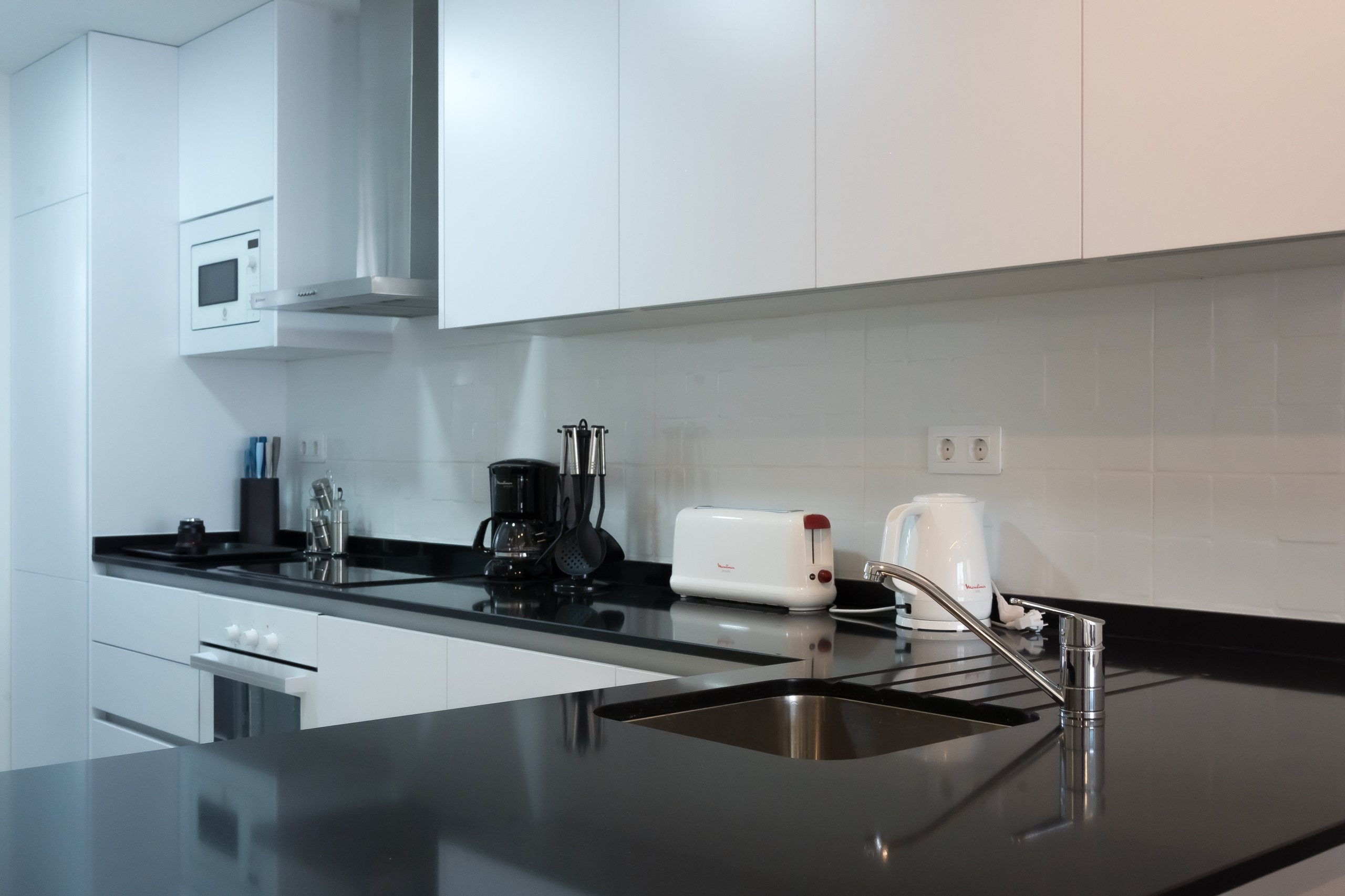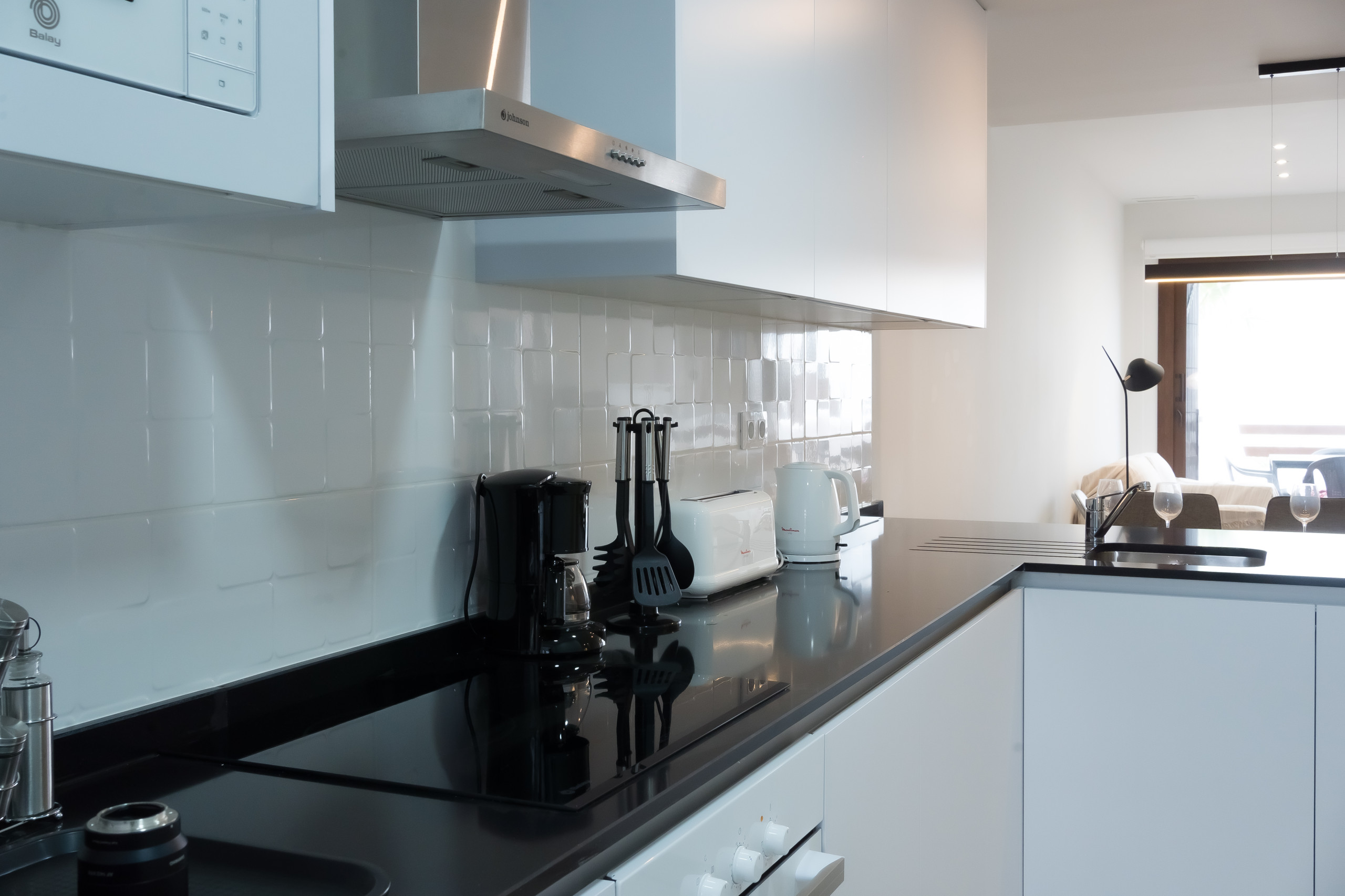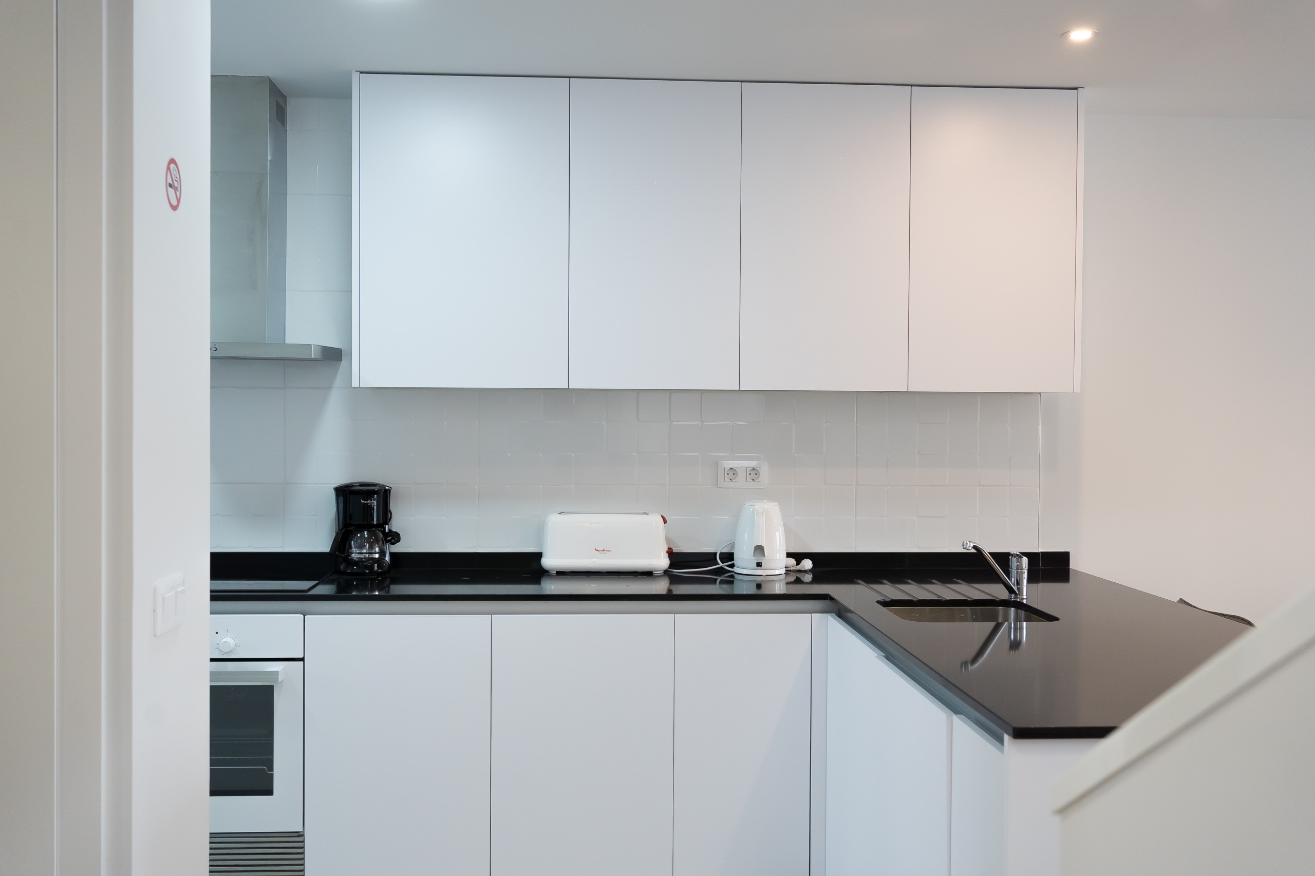 - cocina americana con cocina de inducción, horno eléctrico, microondas, lavavajillas, frigorífico, congelador, cafetera, calentador de agua y tostador