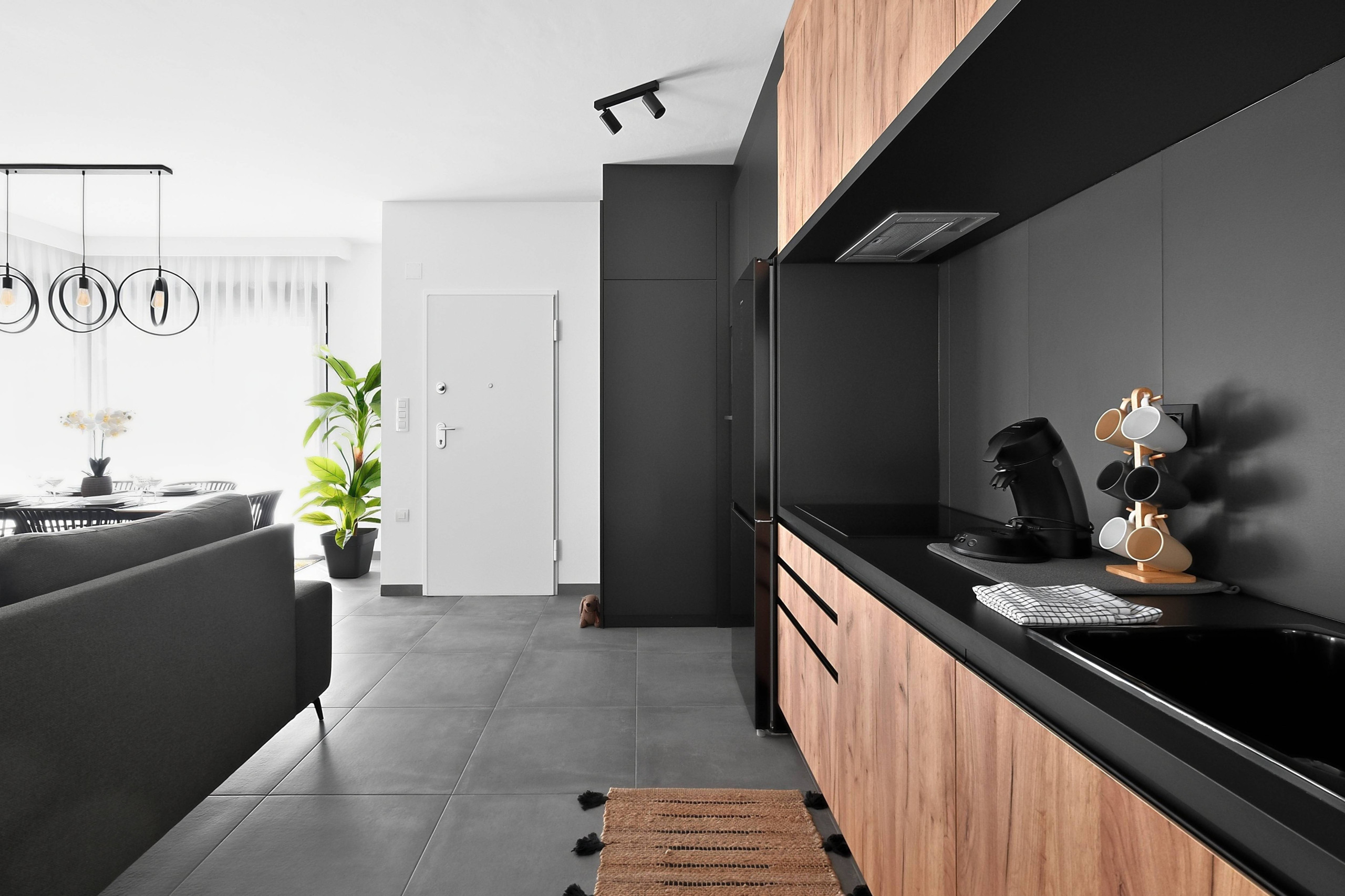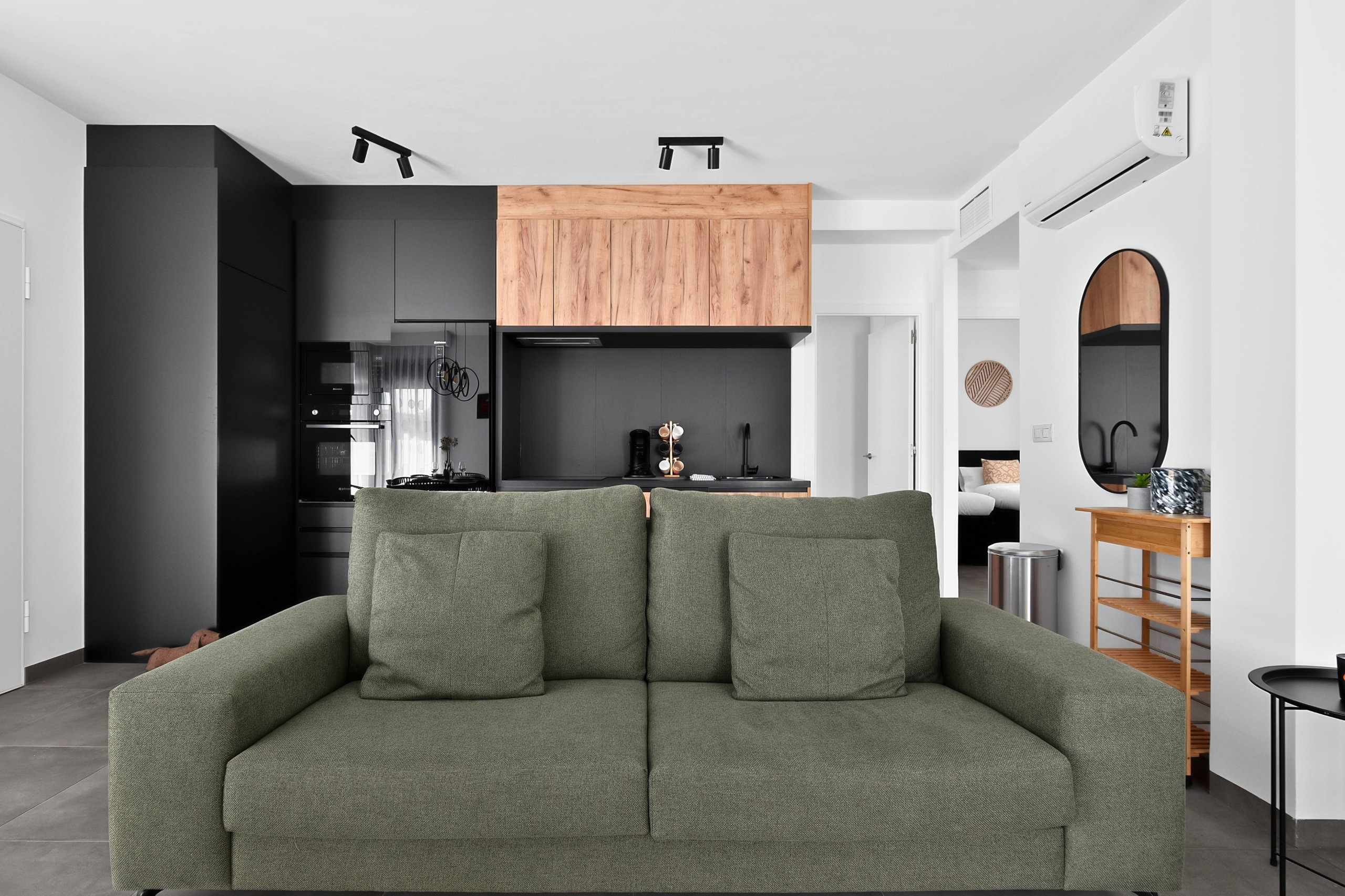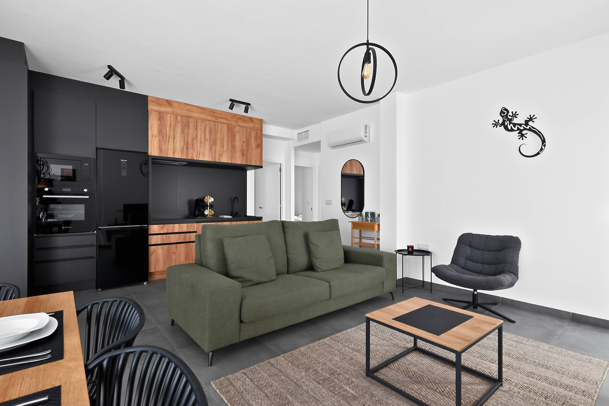 La cocina americana está totalmente equipada con electrodomésticos modernos, incluyendo nevera, congelador, lavavajillas, horno, microondas, cafetera, tostadora, y una amplia variedad de utensilios de cocina. Además, cuenta con conexión WiFi y televisión con canales en español.