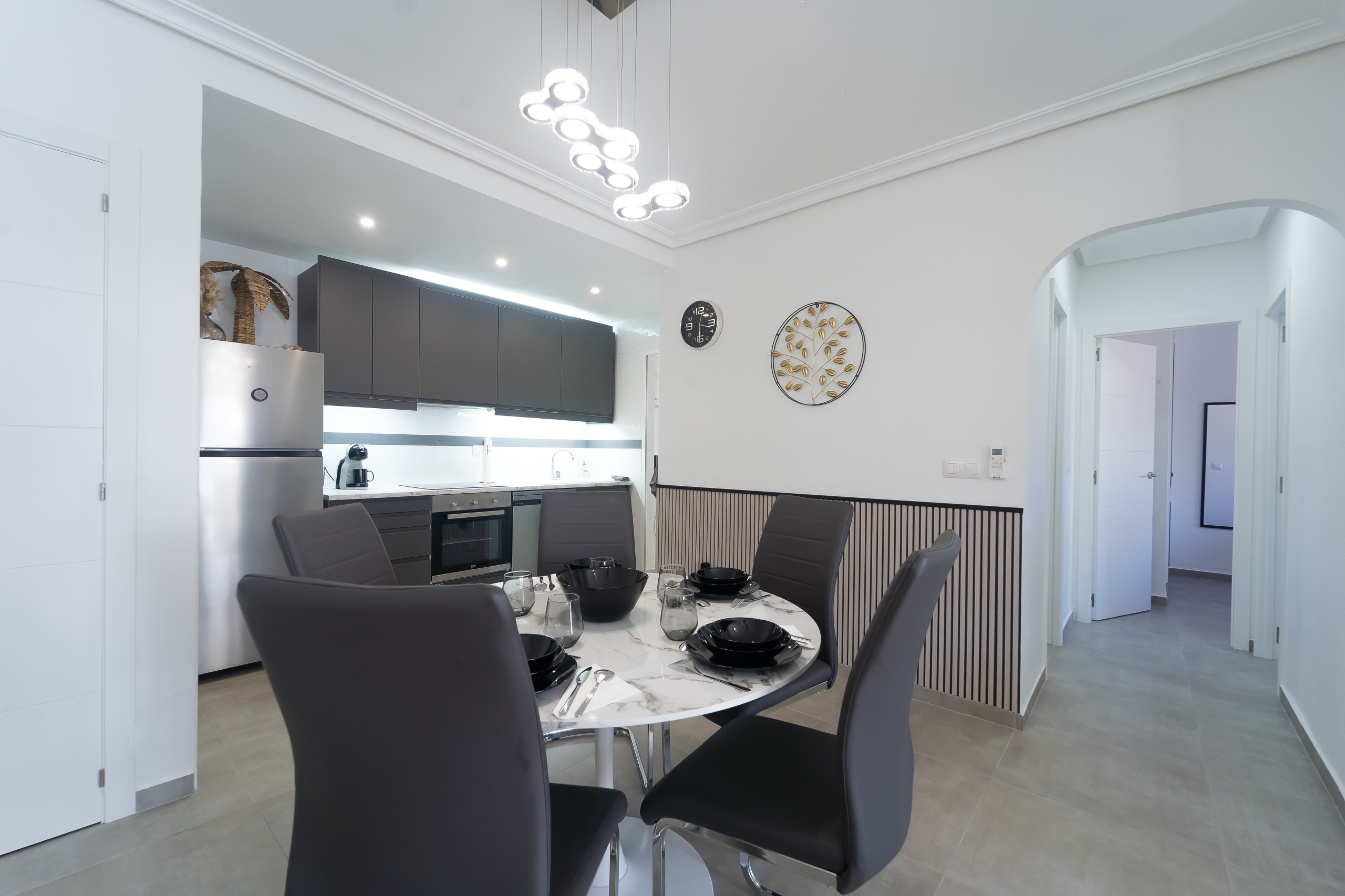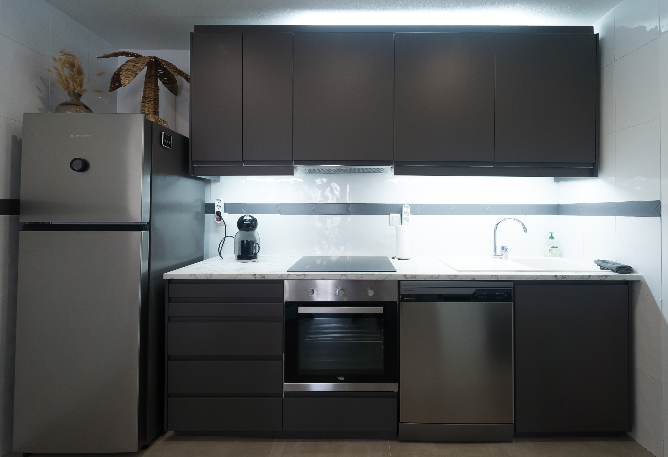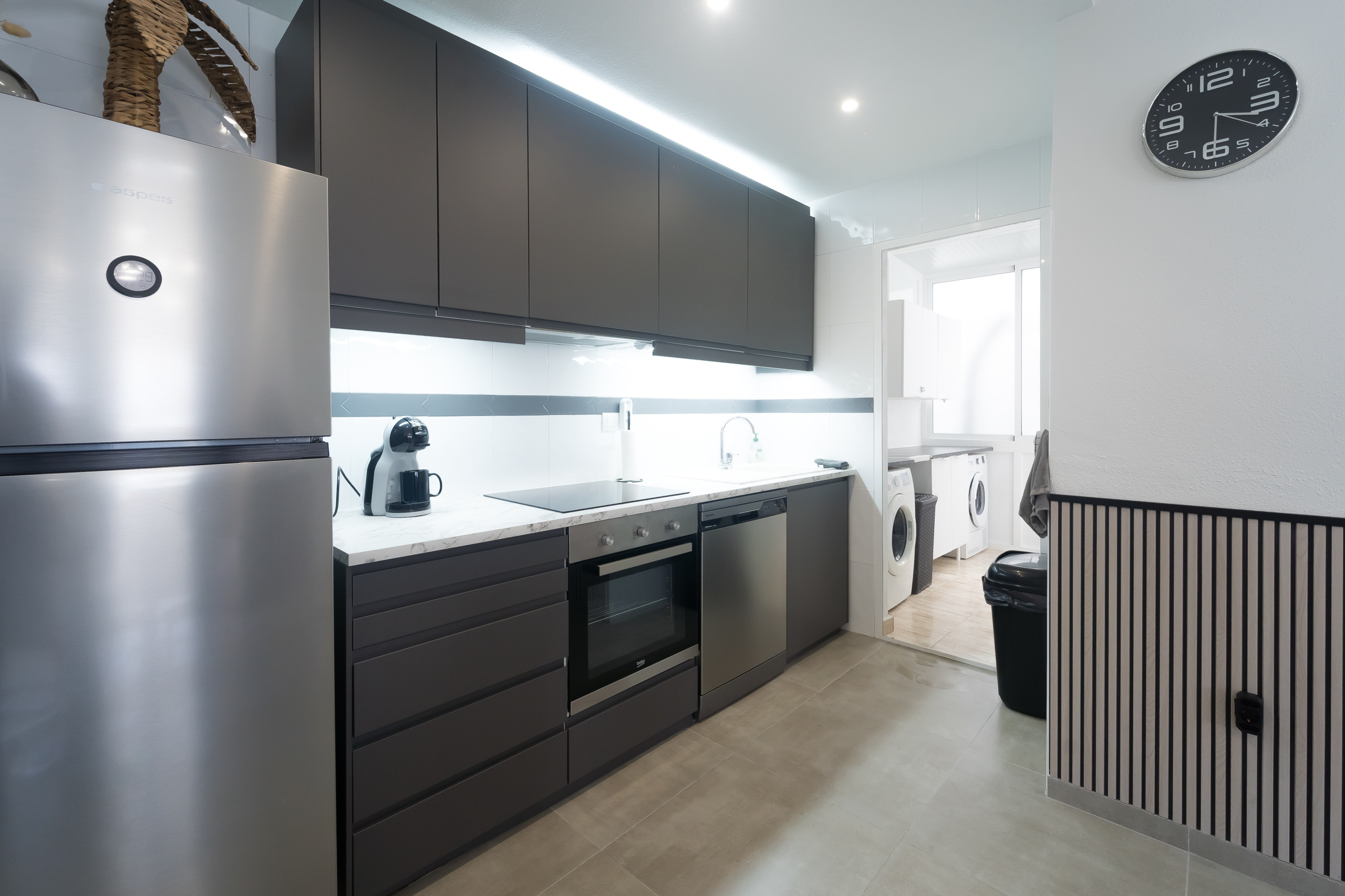 - cuisine américaine avec cuisinière à induction, four électrique, four à micro-ondes, lave-vaisselle, refrigérateur, congélateur, cafetière électrique, bouilloire et grille-pain