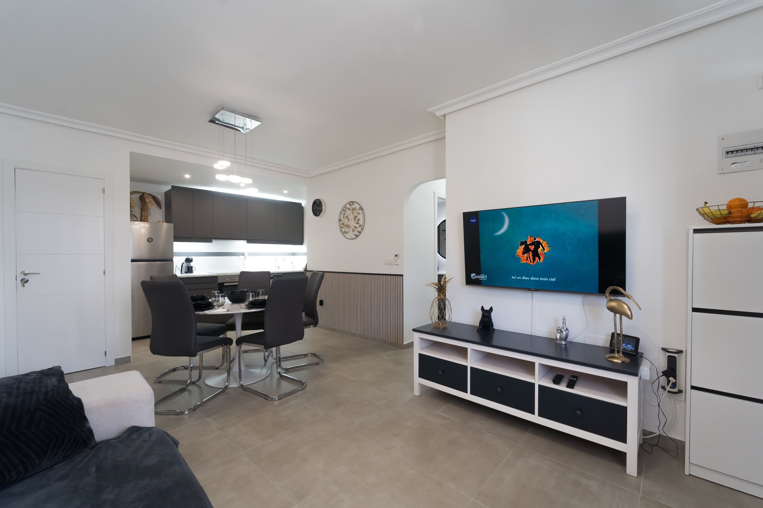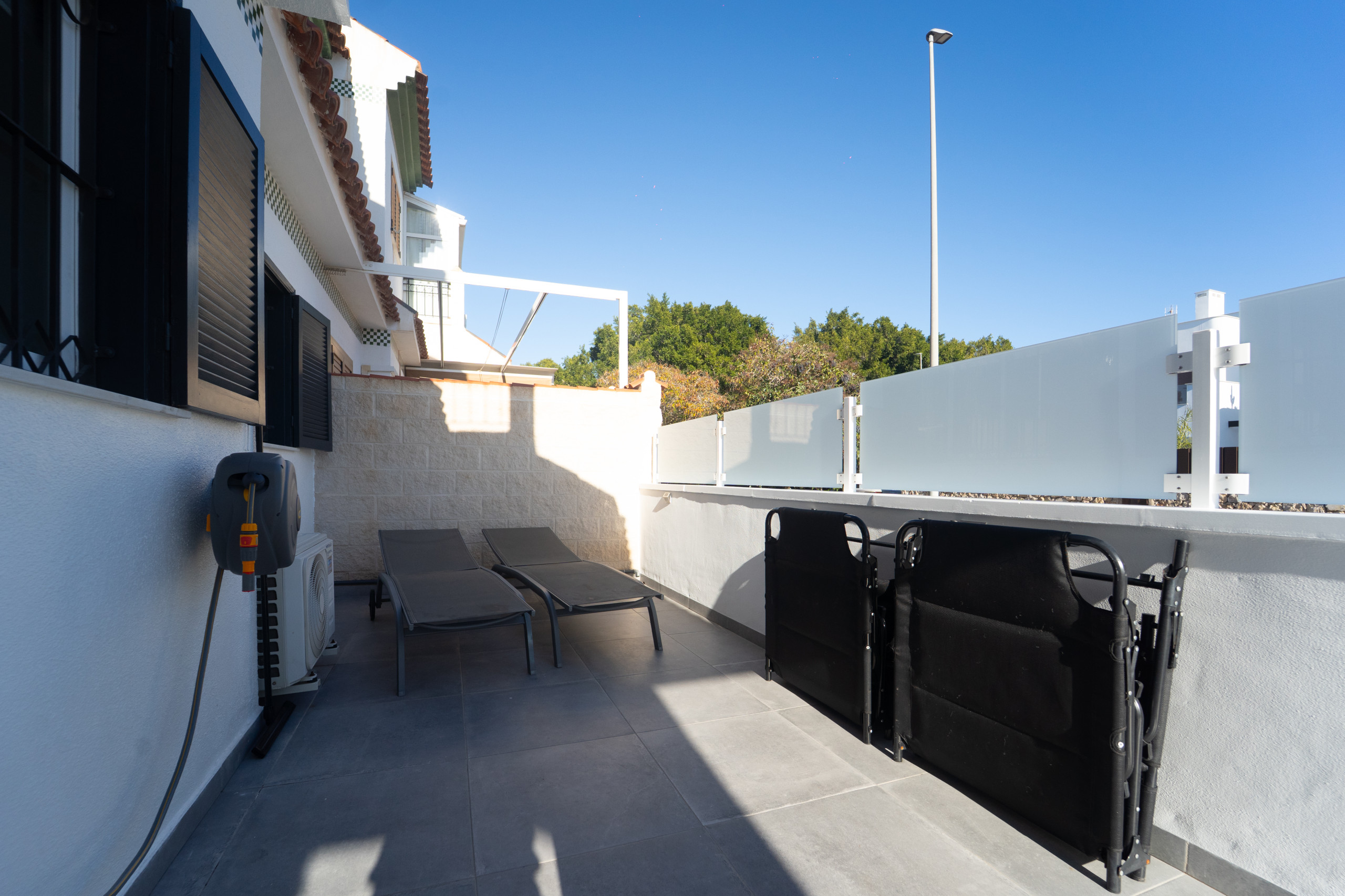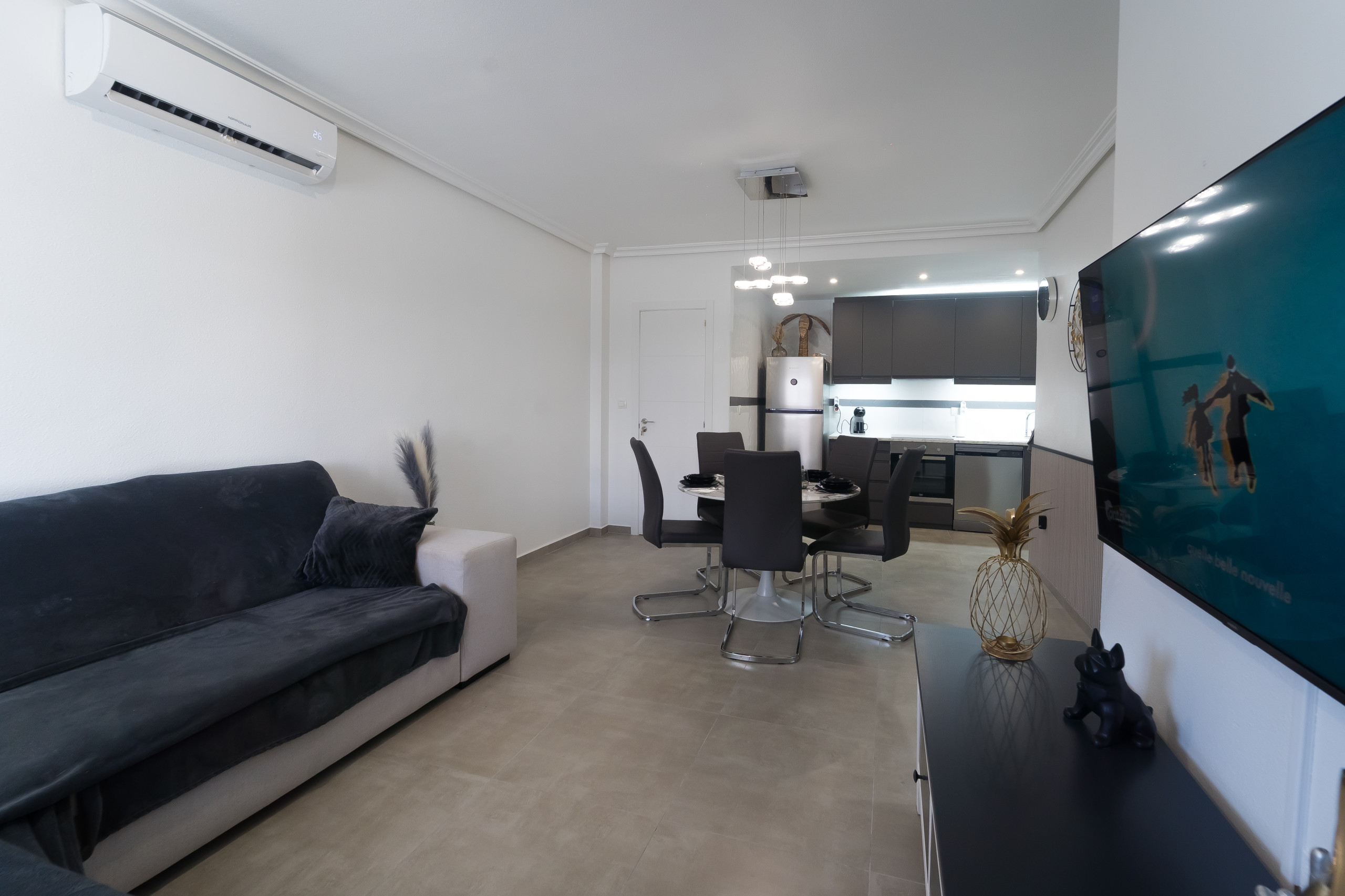 Elle dispose de jardin, mobilier de jardin, clôture, 20 m² de terrasse, lave-linge, accès internet (wifi), chauffage pompe à chaleur, climatisation dans tout le logement, piscine collective, parking extérieur même bâtiment, TV, tv satellite (Langues: Espagnol).