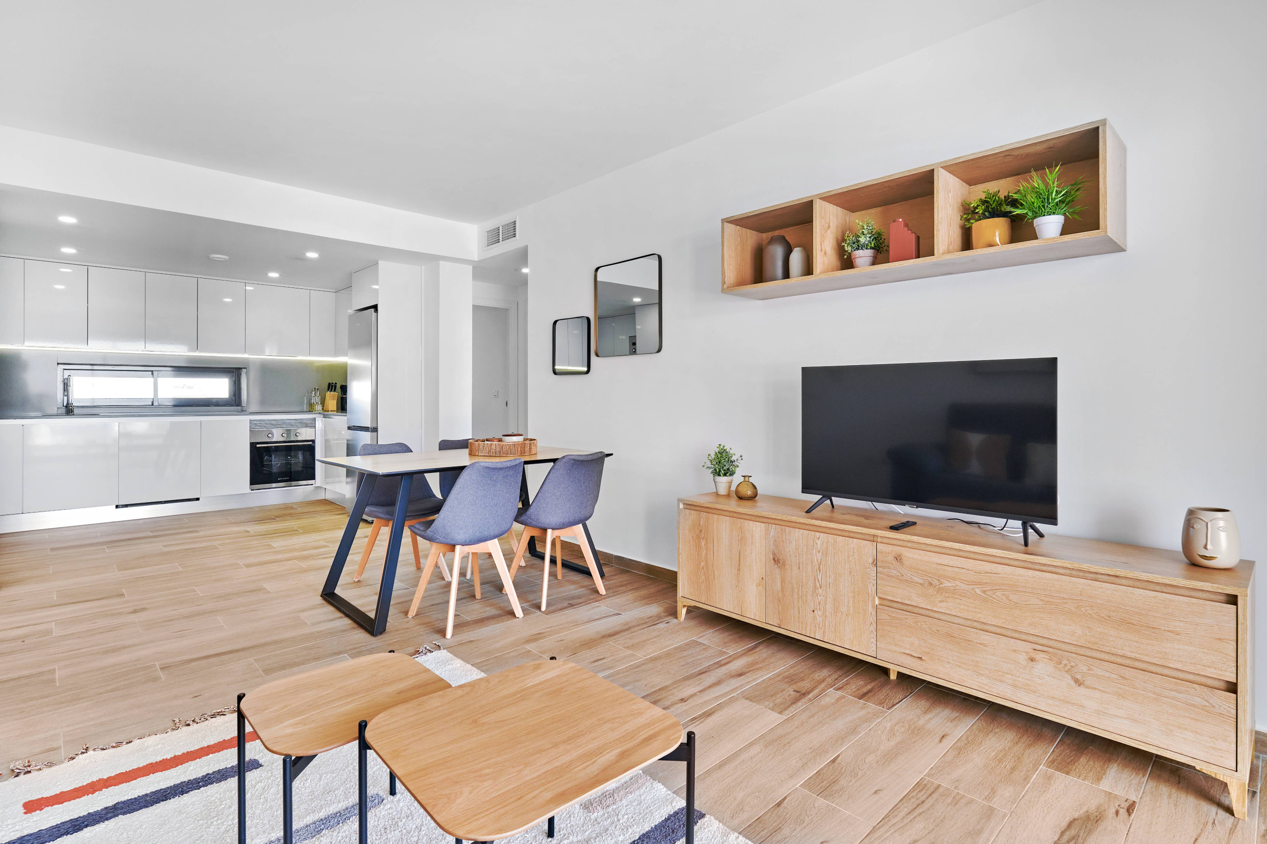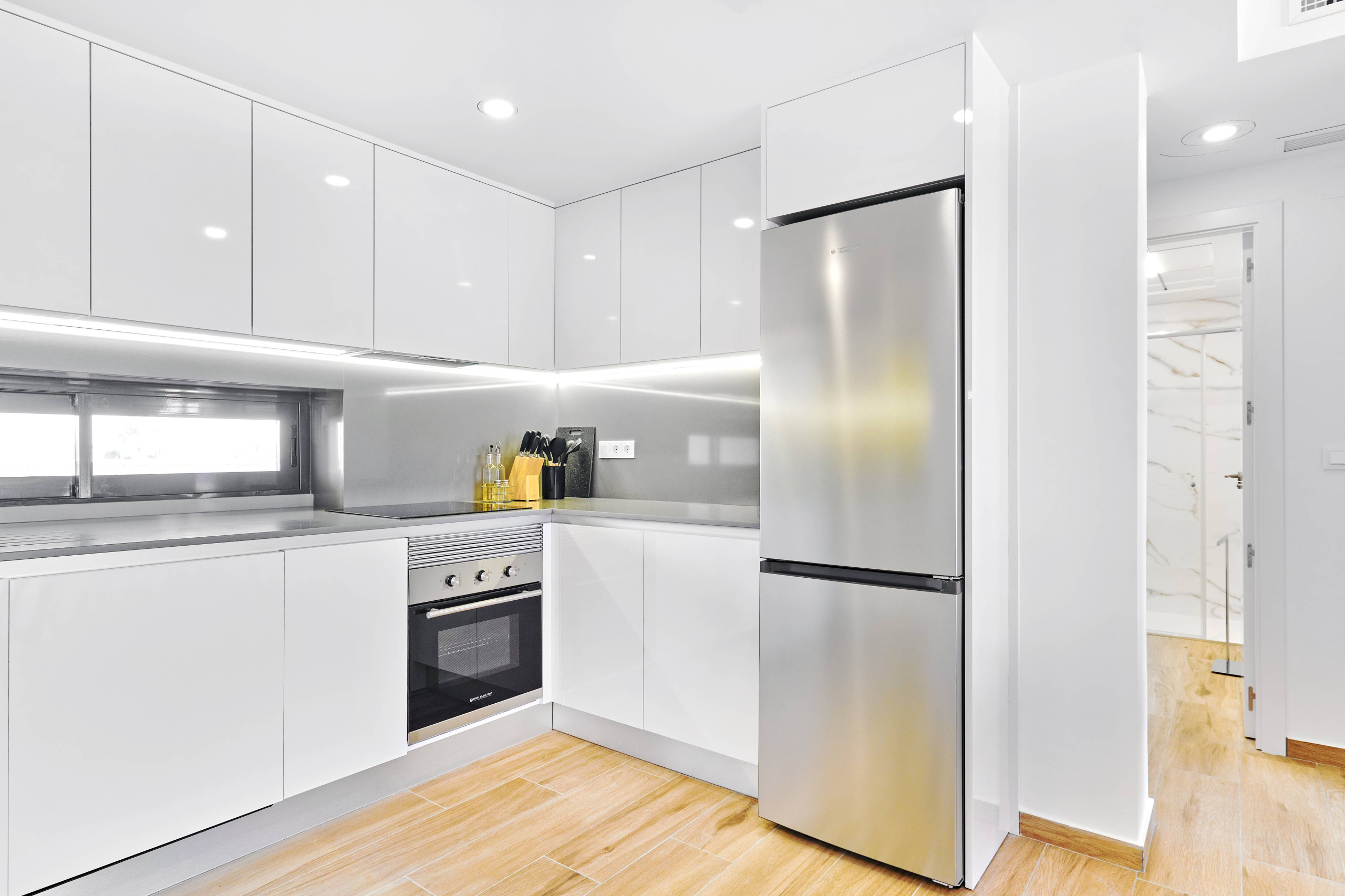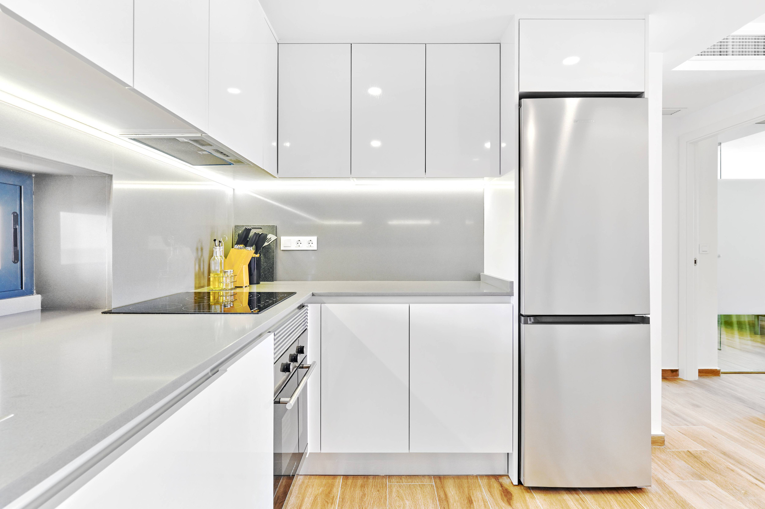 L'appartement dispose de deux chambres, chacune avec un lit double, idéal pour se reposer après une journée d'exploration. Il comprend deux salles de bains avec douche, ce qui facilite la cohabitation et accélère la routine matinale. La cuisine américaine est entièrement équipée d'appareils électroménagers modernes tels que lave-linge, lave-vaisselle, four, micro-ondes, cafetière, grille-pain et presse-fruits, permettant de préparer des repas délicieux avec confort.
