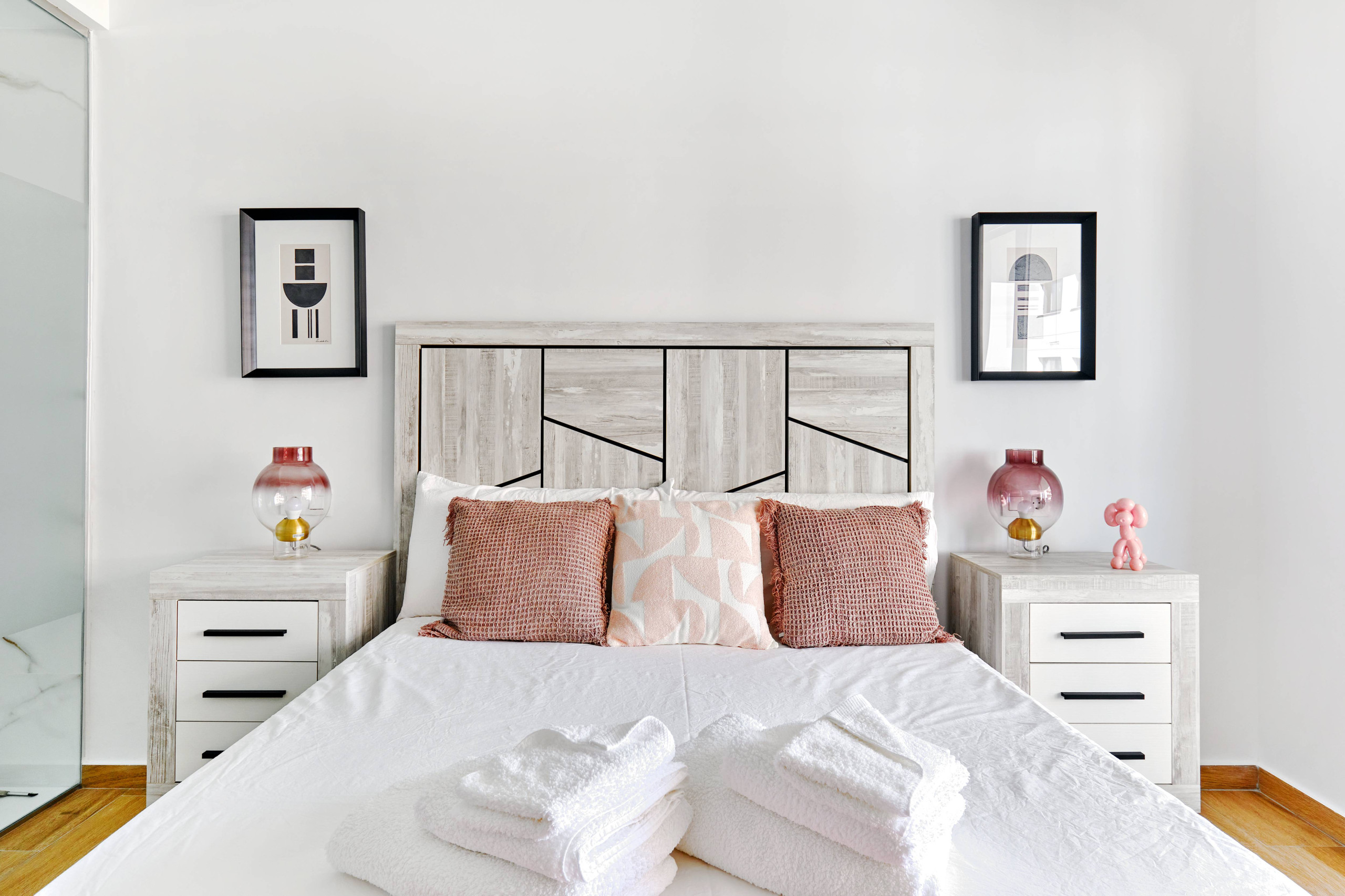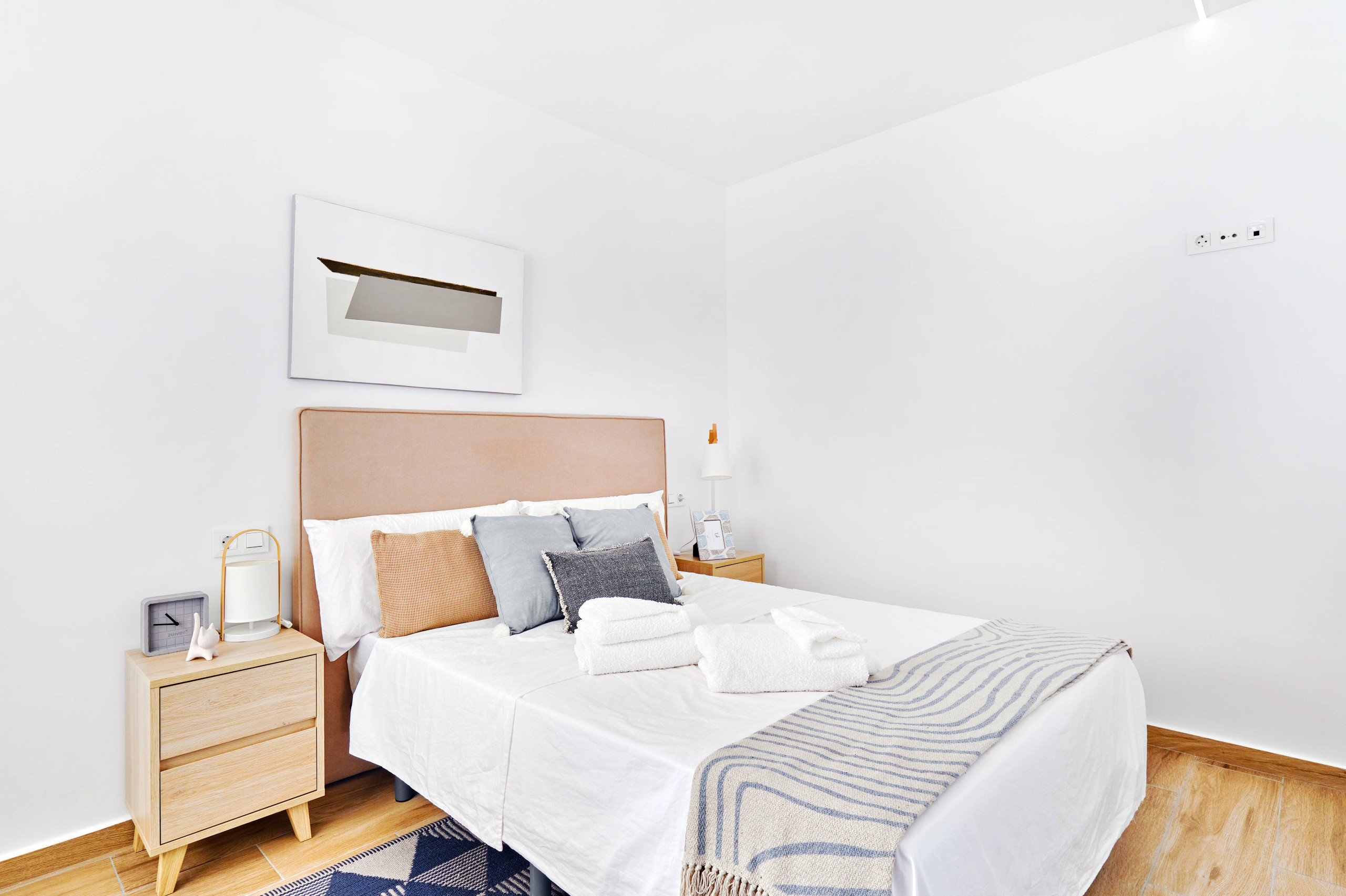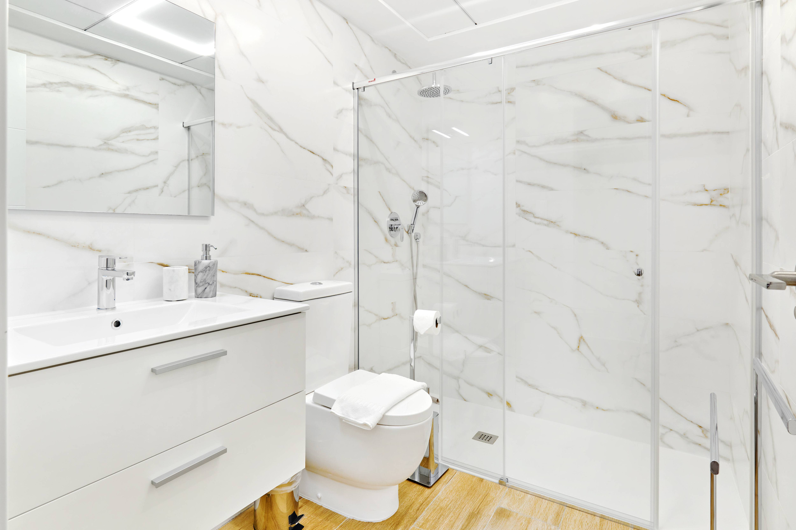 L'appartement dispose de deux chambres, chacune avec un lit double, idéal pour se reposer après une journée d'exploration. Il comprend deux salles de bains avec douche, ce qui facilite la cohabitation et accélère la routine matinale. La cuisine américaine est entièrement équipée d'appareils électroménagers modernes tels que lave-linge, lave-vaisselle, four, micro-ondes, cafetière, grille-pain et presse-fruits, permettant de préparer des repas délicieux avec confort.
