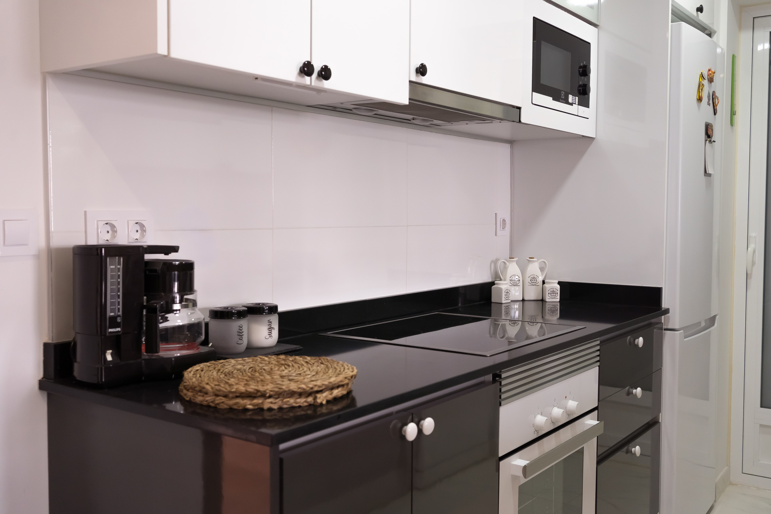 - cuisine américaine avec cuisinière à induction, four électrique, four à micro-ondes, lave-vaisselle, refrigérateur, congélateur, cafetière électrique, bouilloire et grille-pain